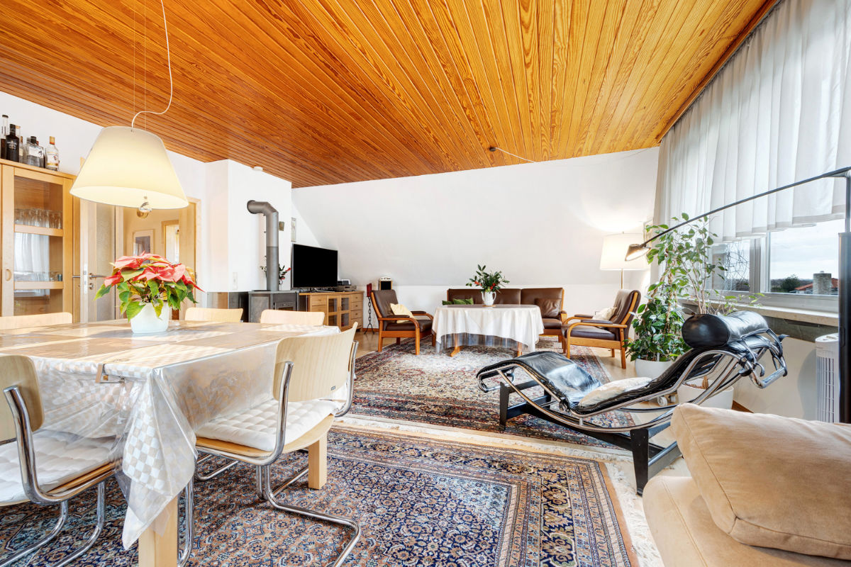 Das Wohnzimmer, 45m2, ist mit Wohn- und Essgruppe für bis zu 8 Personen, sowie mit einer Doppelbettcouch ausgestattet.